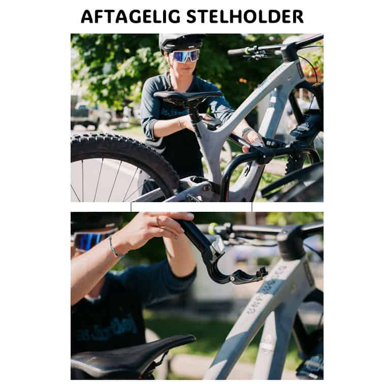 Monteringen på bilen foregår enkelt og med et ergonomisk greb. Indstiller sig automatisk vandret og du nedfælder blot monteringsarmen og du er køreklar. Cyklerne forankres solidt i de justerbare hjulholdere samt i den bløde stelholder som i øvrigt er velegnet til cykler med carbonstel. Den yderste cykel har aftagelig gribearm, så du nemmere kan forankre denne.