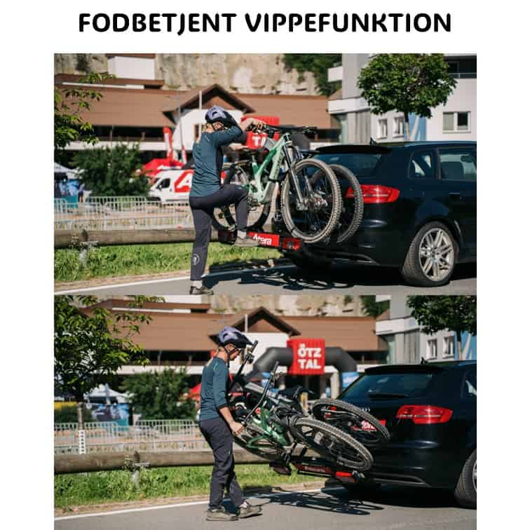 Skal du i bilens bagagerum undervejs på rejsen, kan du vippe cykelholderen bagover med den fodbetjente vippefunktion