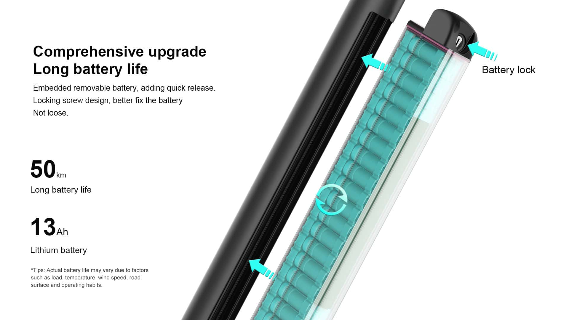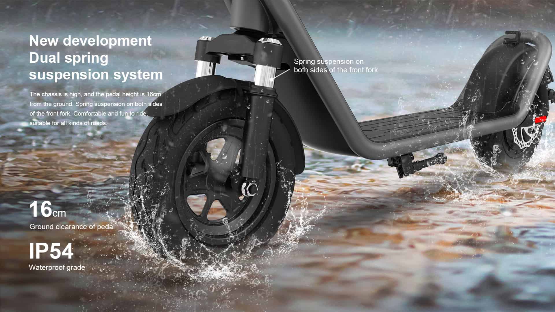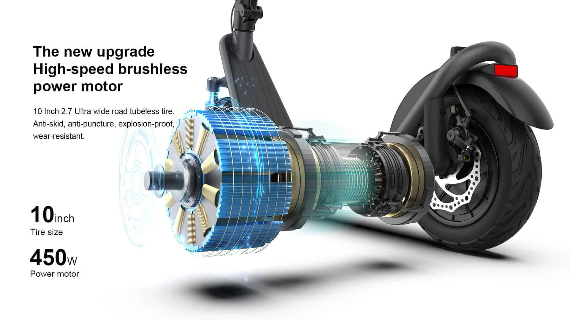 Med sit udskiftelige ekstra kraftige batteri, 450W effektfuld motor og store komforthjul samt indbyggede støddæmpere, kan du køre mange kilometer på hver opladning. Modellen har store 10 tommer hjul med luft gummidæk, som giver en ekstra komfort.