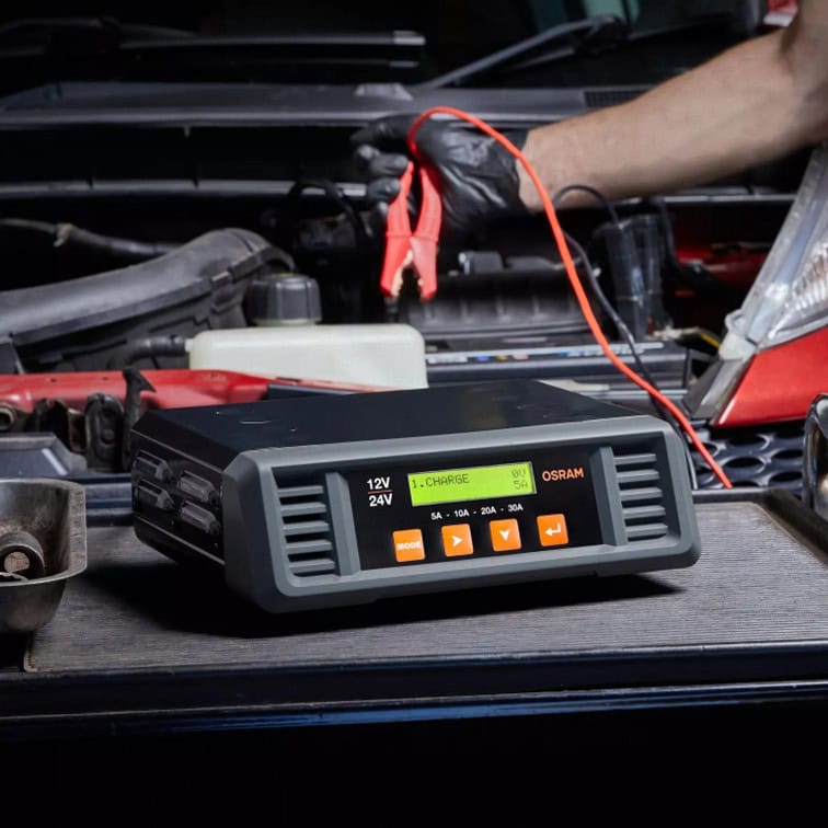 OSRAMs professionelle batterioplader med integreret LCD-skærm gennemgår en 8-trins opladningscyklus for lithiumbatterier og en 9-trins opladningscyklus for alle andre batterier for at optimere batteriets ydeevne og forbedre opladningsbevarelsen.