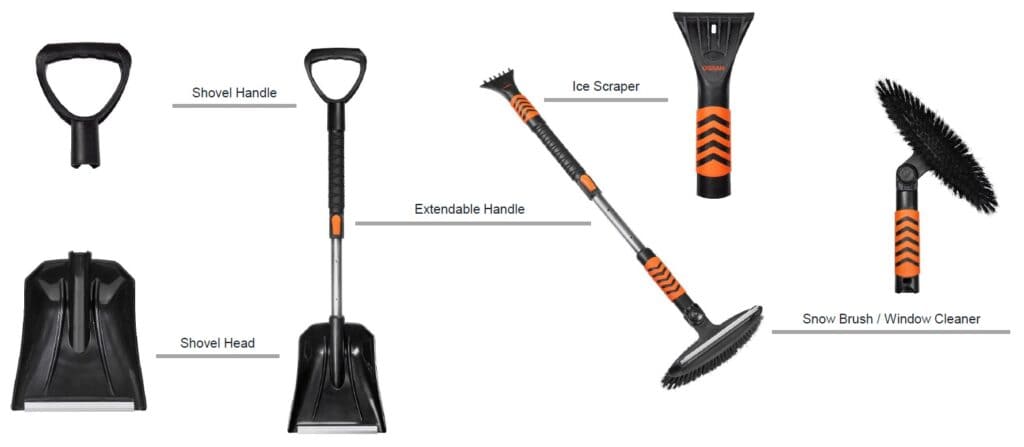 • Skovl: fjerner sammenpresset eller ophobet sne effektivt; integreret metalspids. 106cm længde