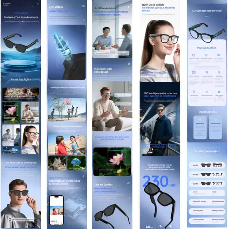 Geniale smart-solbriller fra PowerTrend. Du kan bruge dem som solbriller og undervejs på din cykeltur, scooter, løbetur, skitur, gåtur eller anvende i bilen, ja overalt kan du tage HD-billeder, optage HD-videoer med blot en besked eller et tryk på brillen. Du kan også kigge på et motiv og få oplyst hvad du ser på via dens indbyggede højtalere. Fungerer også som høretelefoner om du vælger at lytte til en podcast eller musik, og udelukker delvist udenomsstøj med ANC samt sortere dens ENC funktion generende udenomsstøj for den du taler i telefon med.