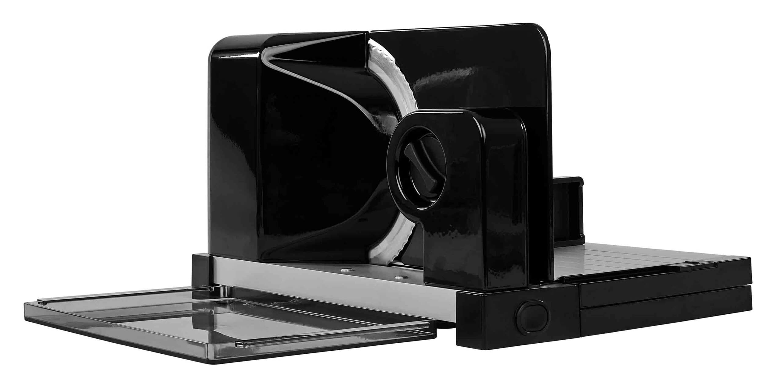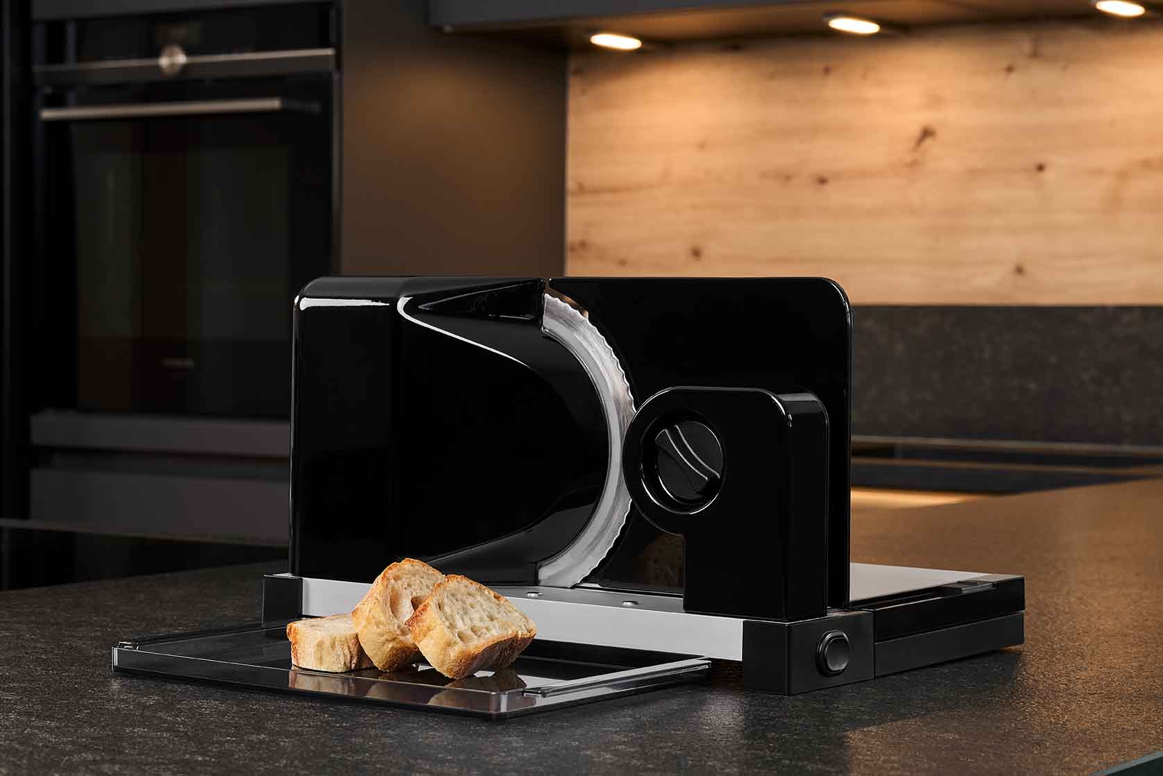 Når elexa5 foldes sammen igen efter skæringen, er maskinen kun 10 cm bred og passer derfor perfekt i selv mindre køkkener. Når den er foldet ud, fylder den meget lidt på køkkenbordet, selvom slæden er ca. 20 cm lang. Hvis du vil skære større fødevarer, såsom et stort brød eller et generøst stykke bacon, kan slæden nemt låses op og endda fjernes helt.
