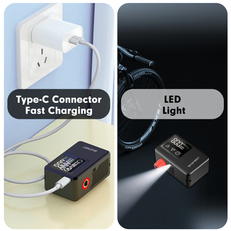 Pumpen kan trinløst justeres fra 0 til 130 PSI (9 bar), og stopper automatisk med at pumpe, når det ønskede tryk er nået. Genoplades med type USB-C hurtigopladning.
