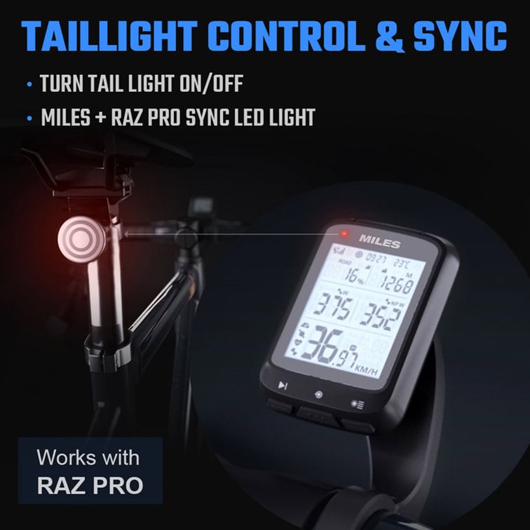 Miles fungerer perfekt sammen med de intelligente cykellygter Raz Pro (SR-BTL20), der synkroniseres med displayet og automatisk signalerer bremse og lysstyrke – så du altid er synlig på vejen.